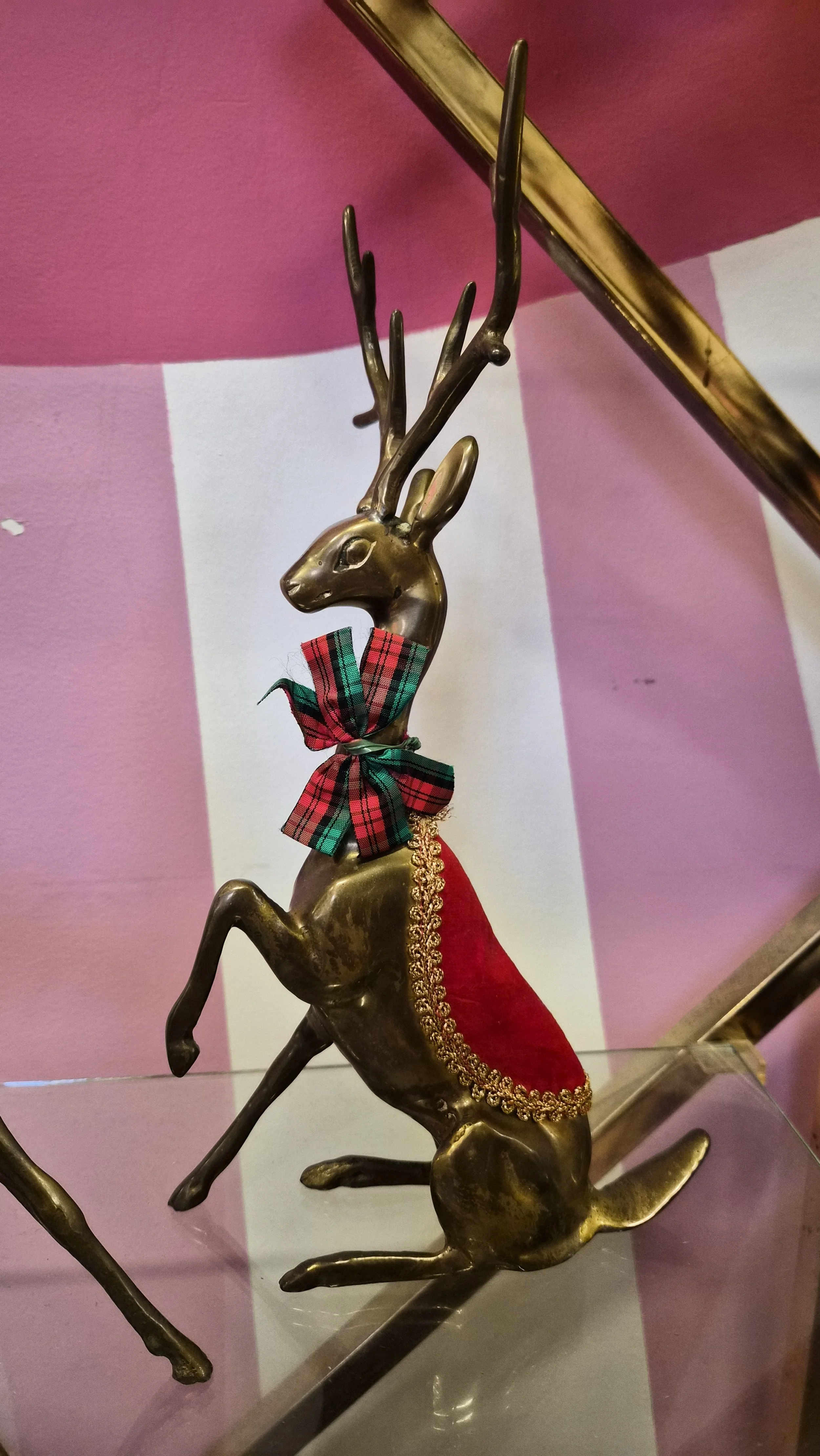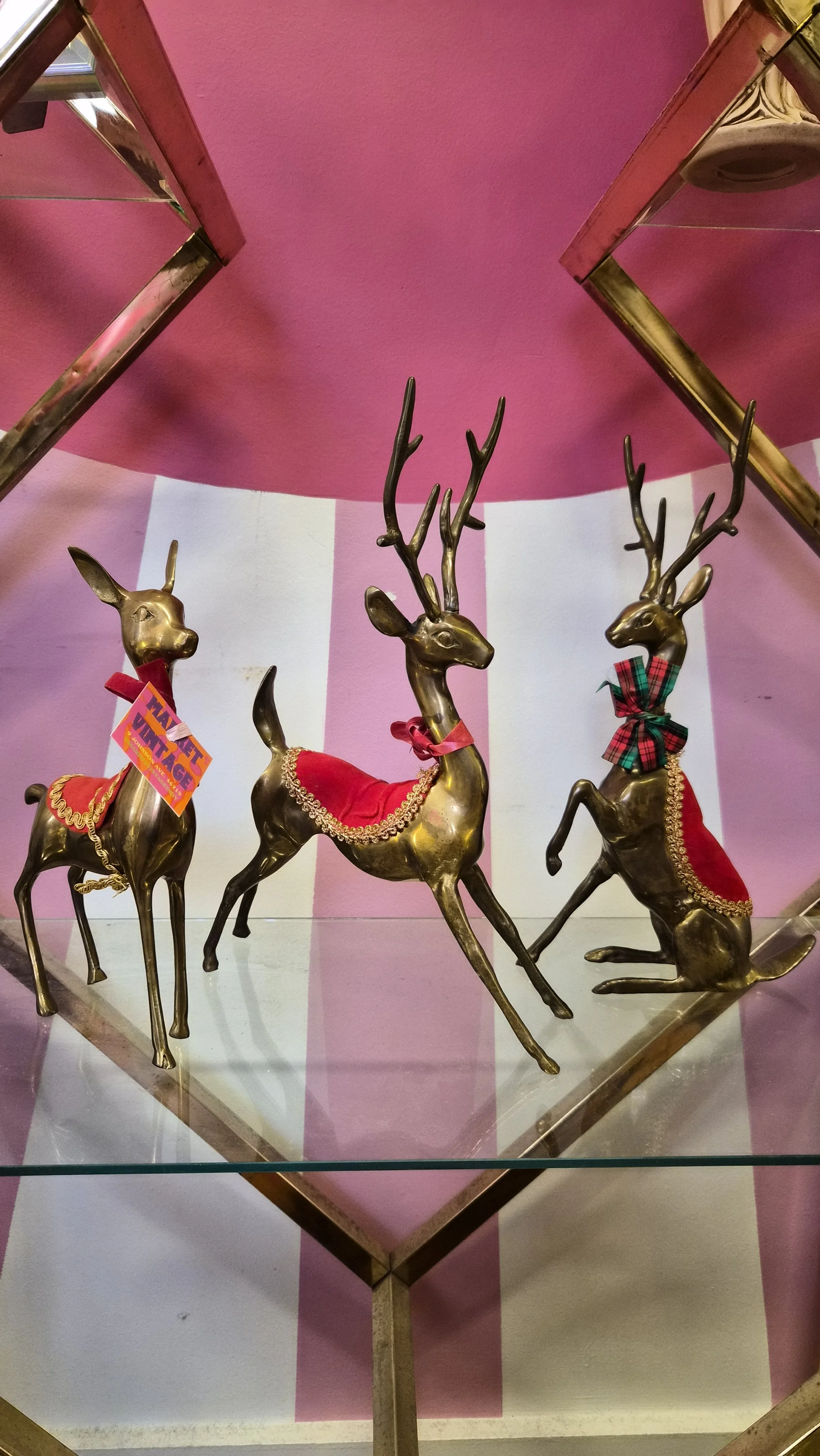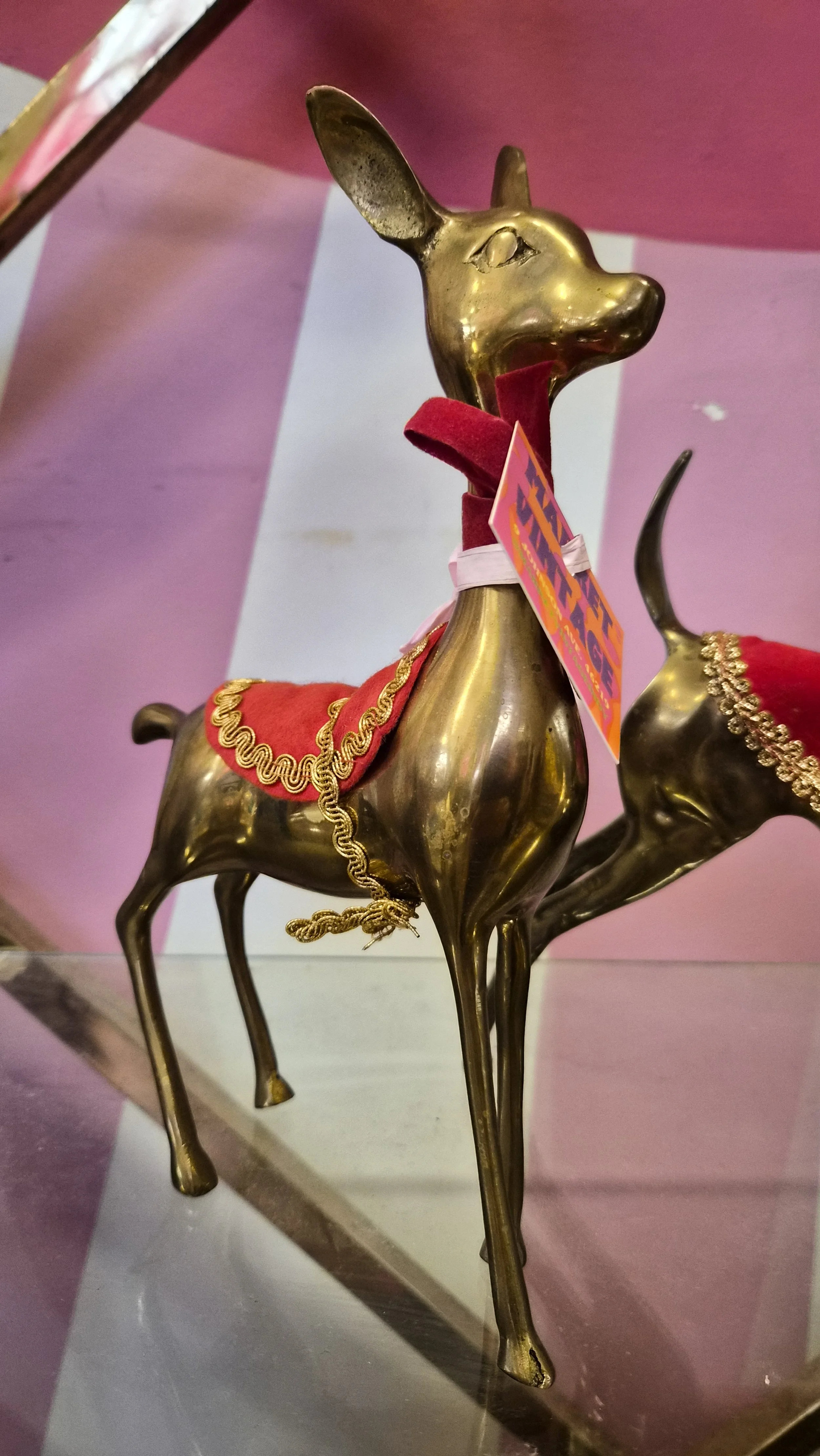 Mid Century Modern solid brass reindeer trio. Marked “made in Taiwan Republic of China” to the maker label. See images for details. The horned reindeer each measure approximately 12” in height.