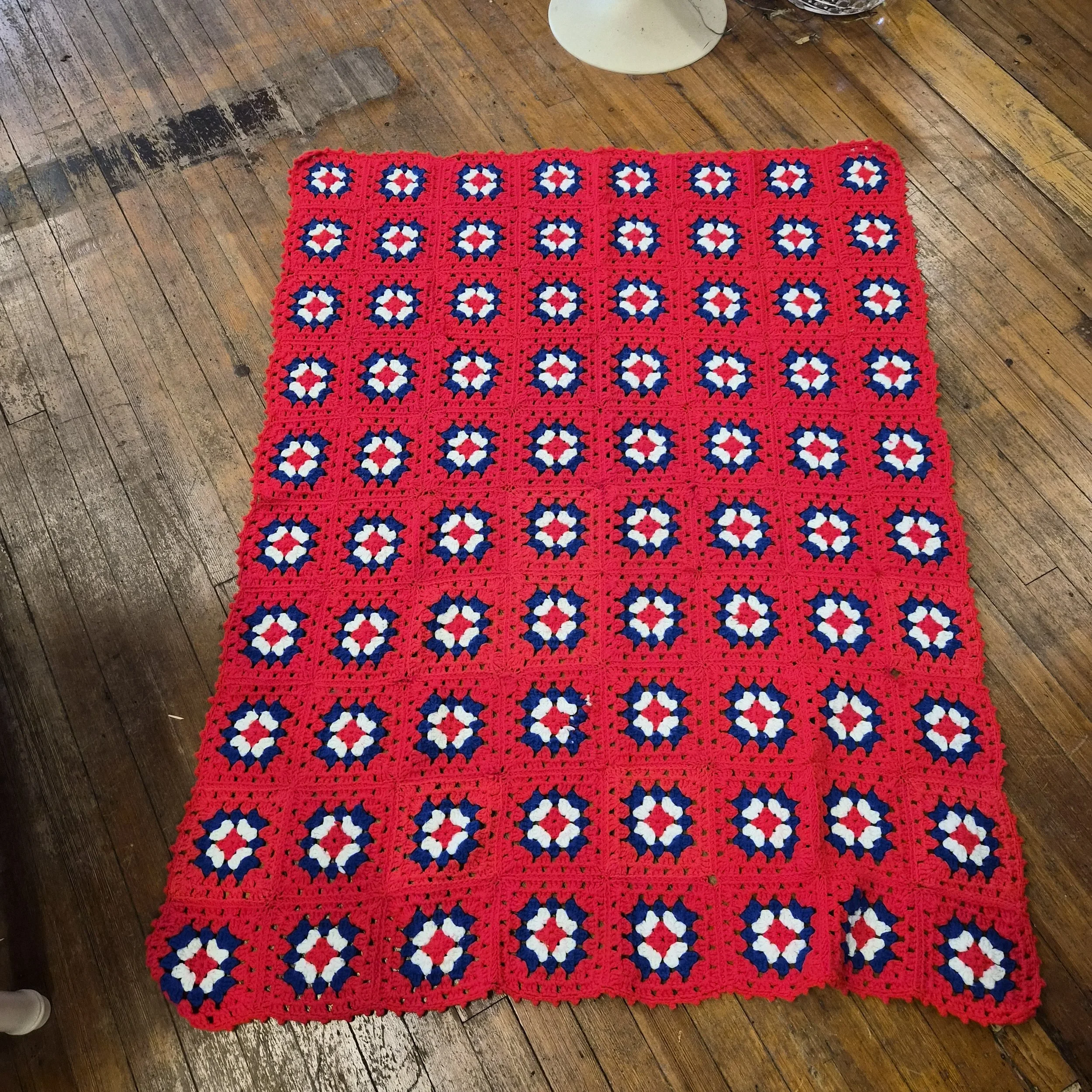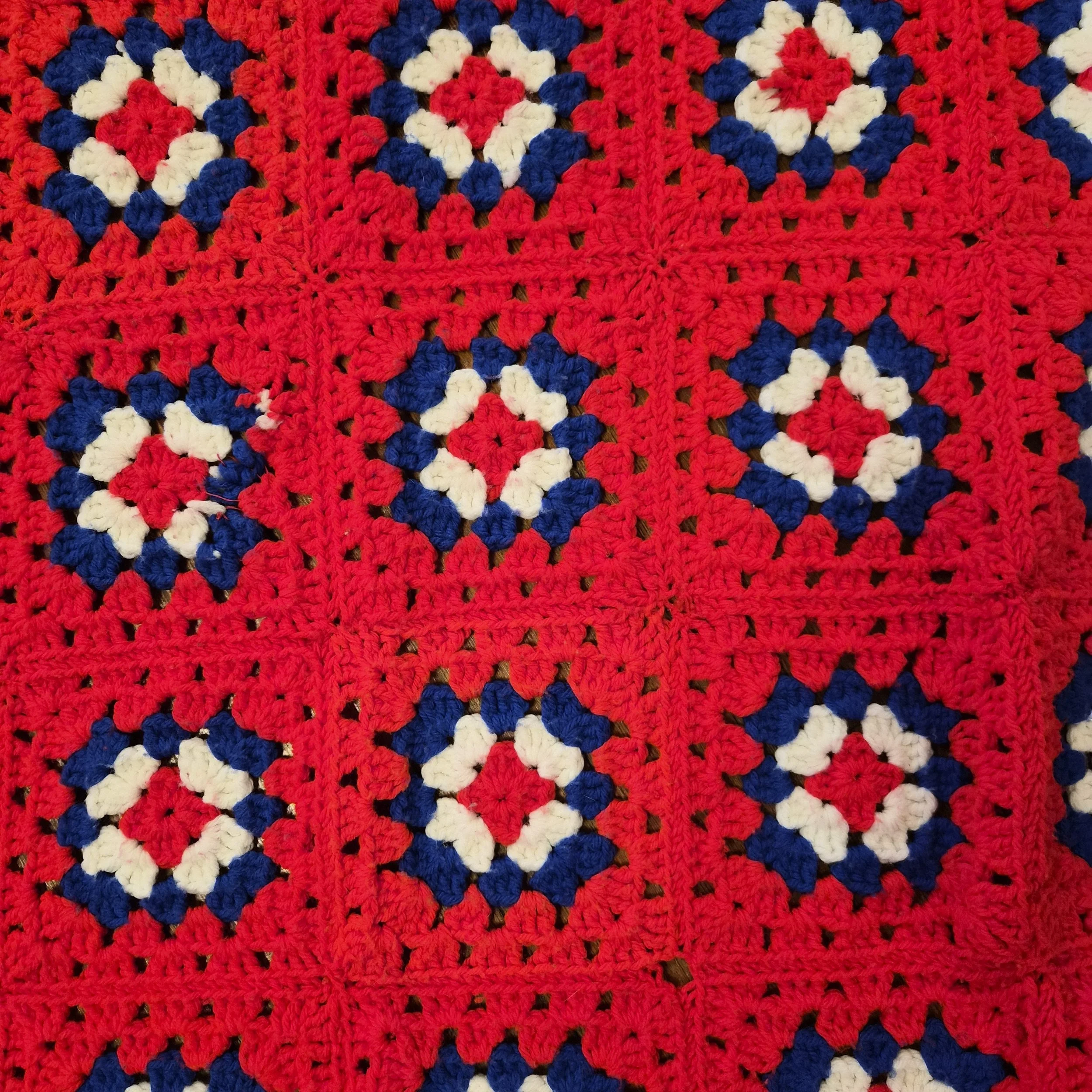 Vintage Crochet throw blanket or afghan in red white and blue. Thrle blanket features patriotic granny squares. It is made up of individual crocheted squares sewn together, featuring a red border and background with red, white, and blue squares in a geometric pattern.