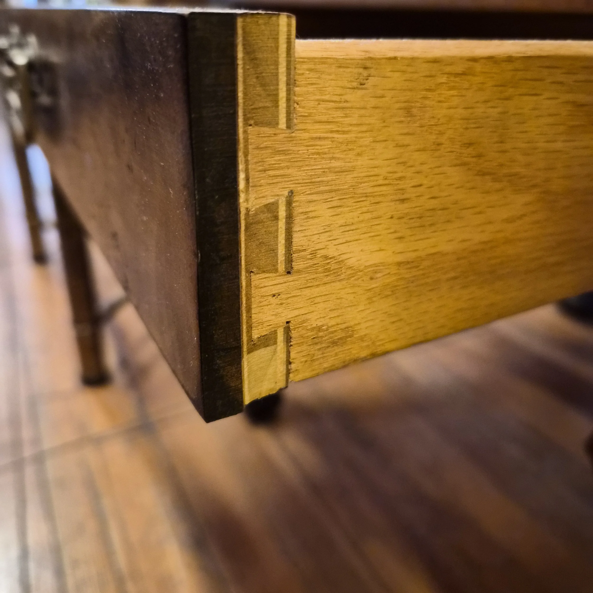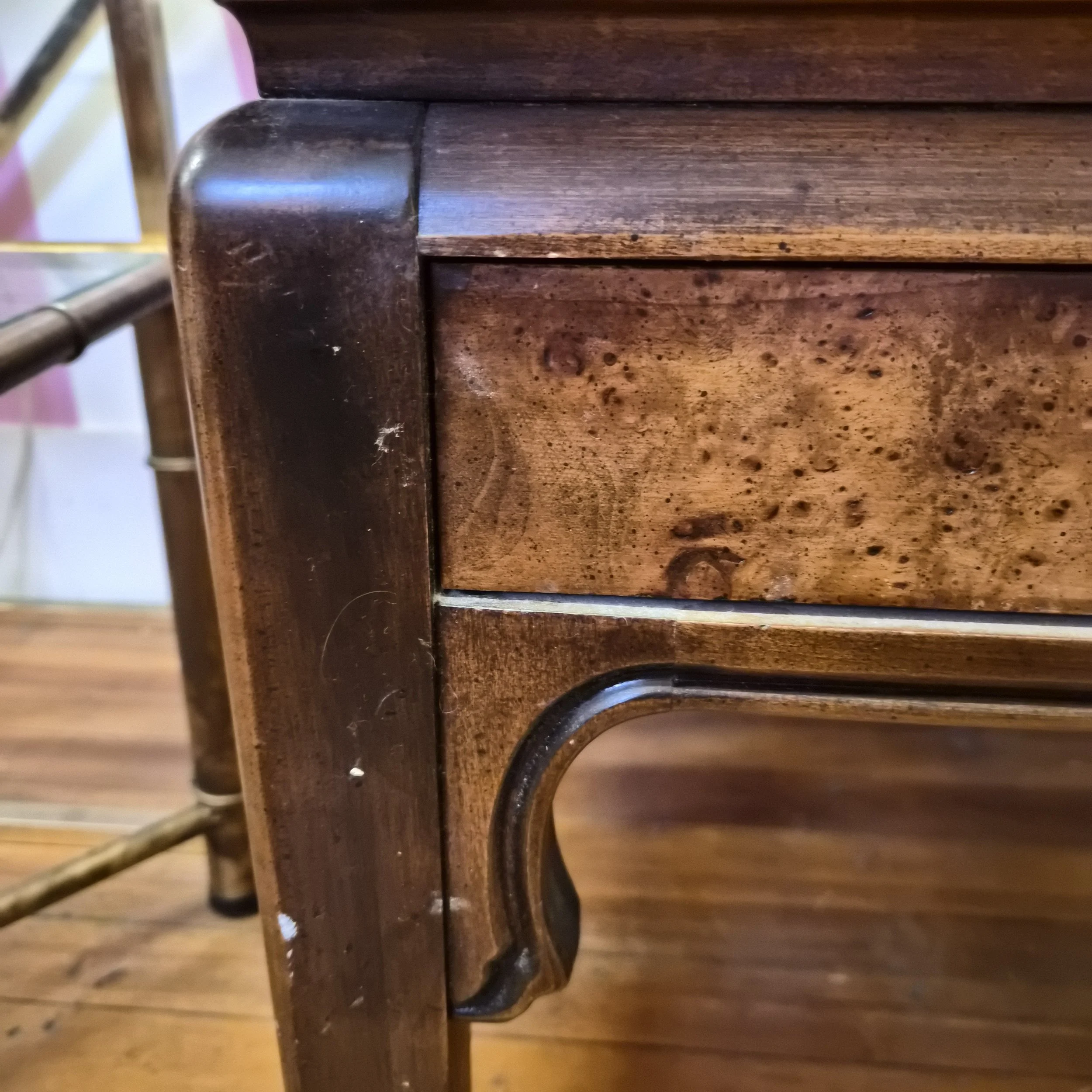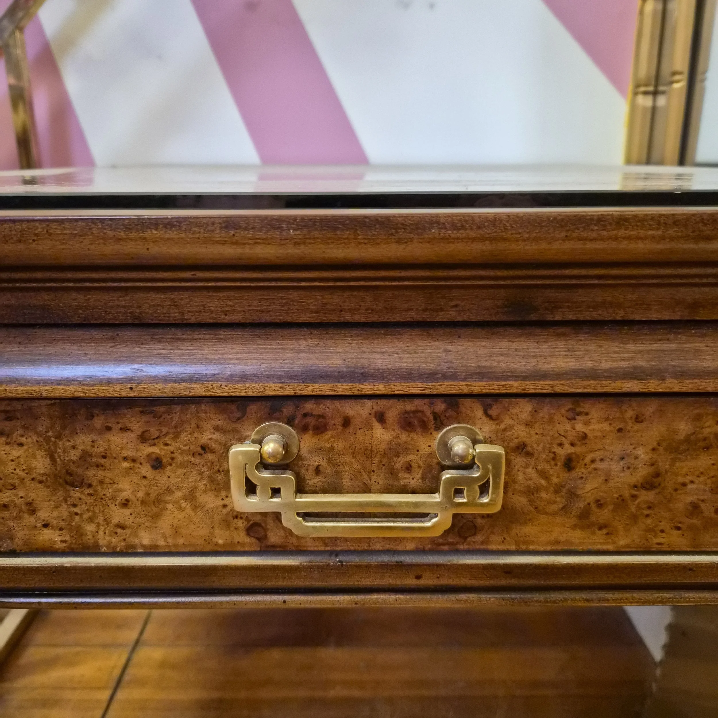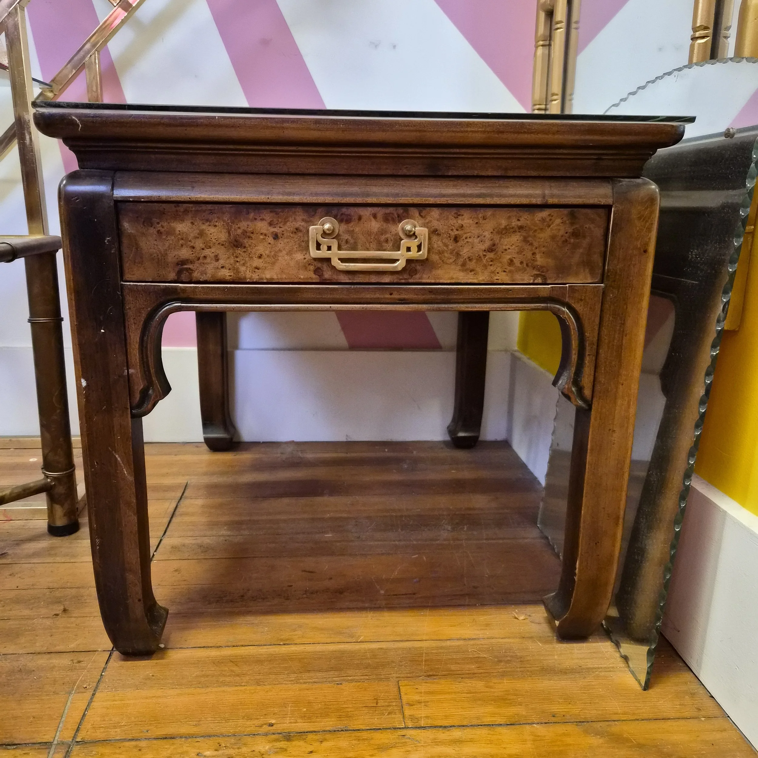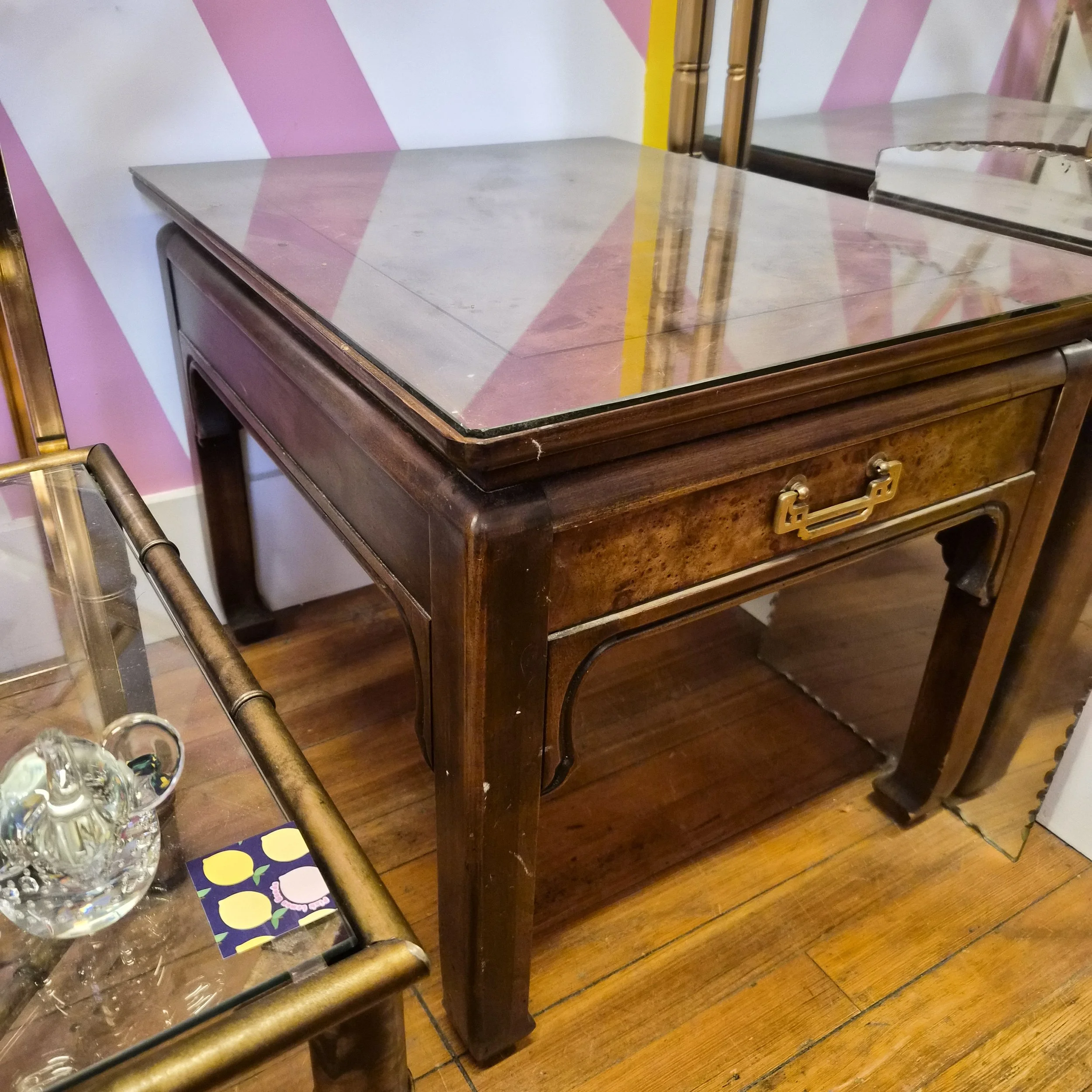 This is a pair of Brandt Furniture end tables. Each table features a burlwood top with a removeable protective glass overlay. Each table features a single drawer with dovetail joinery, and square legs with decorative scrolled detail. See images for wear and details.