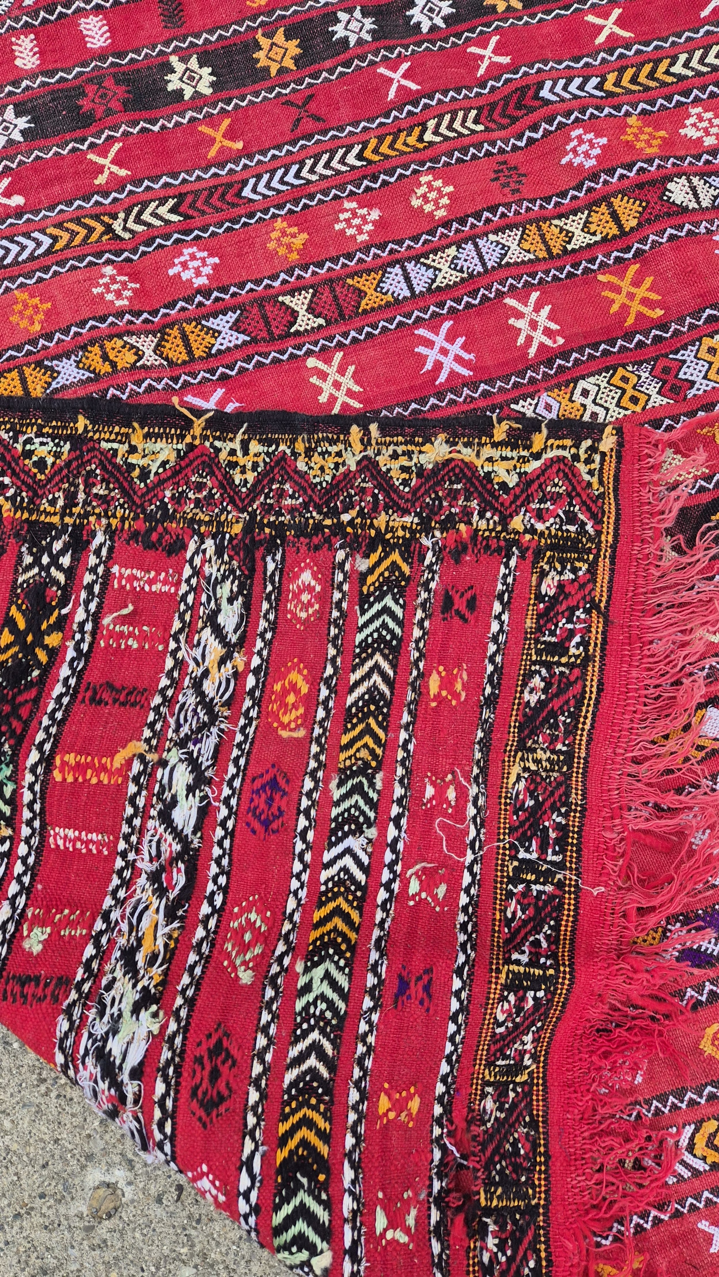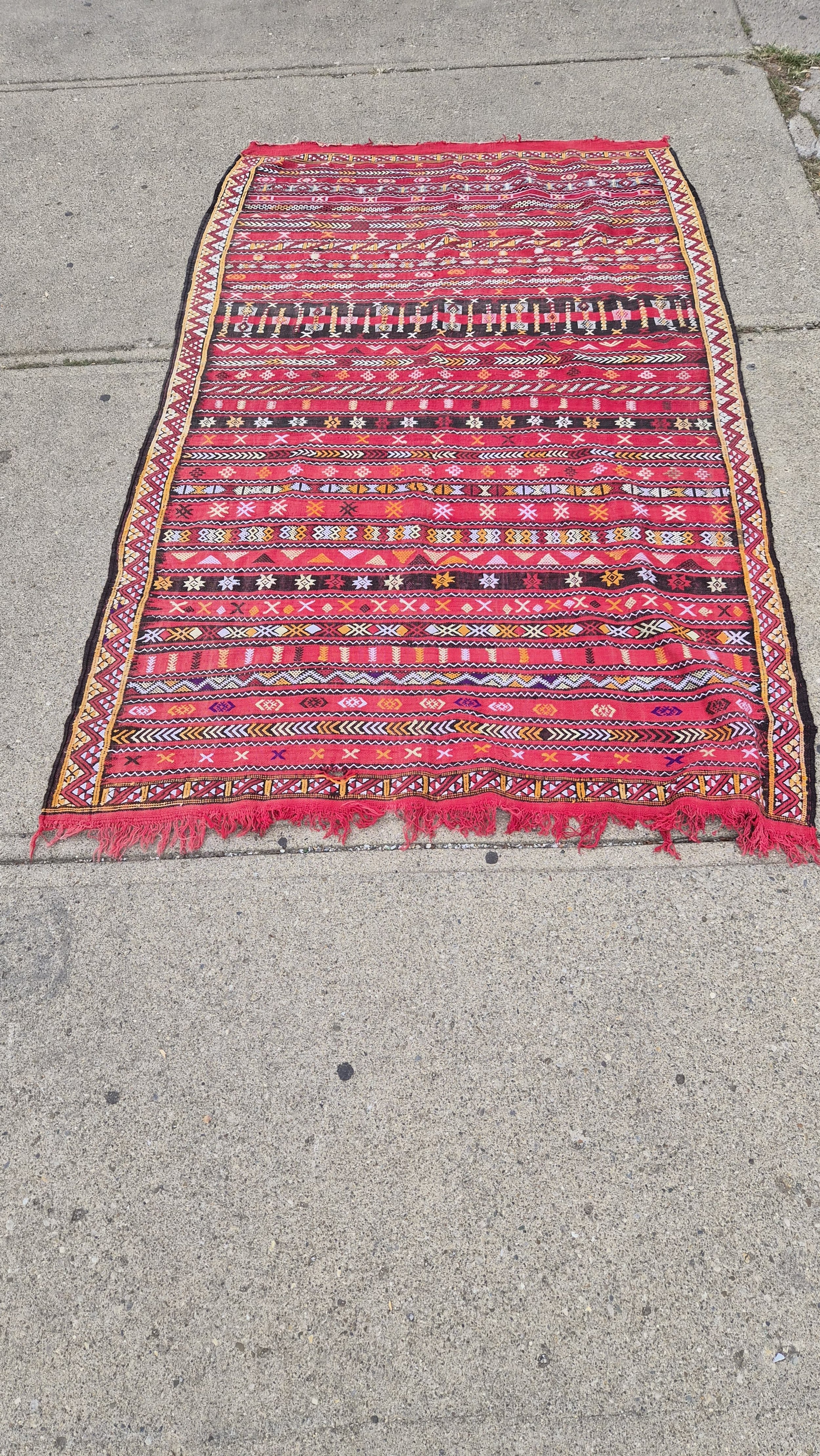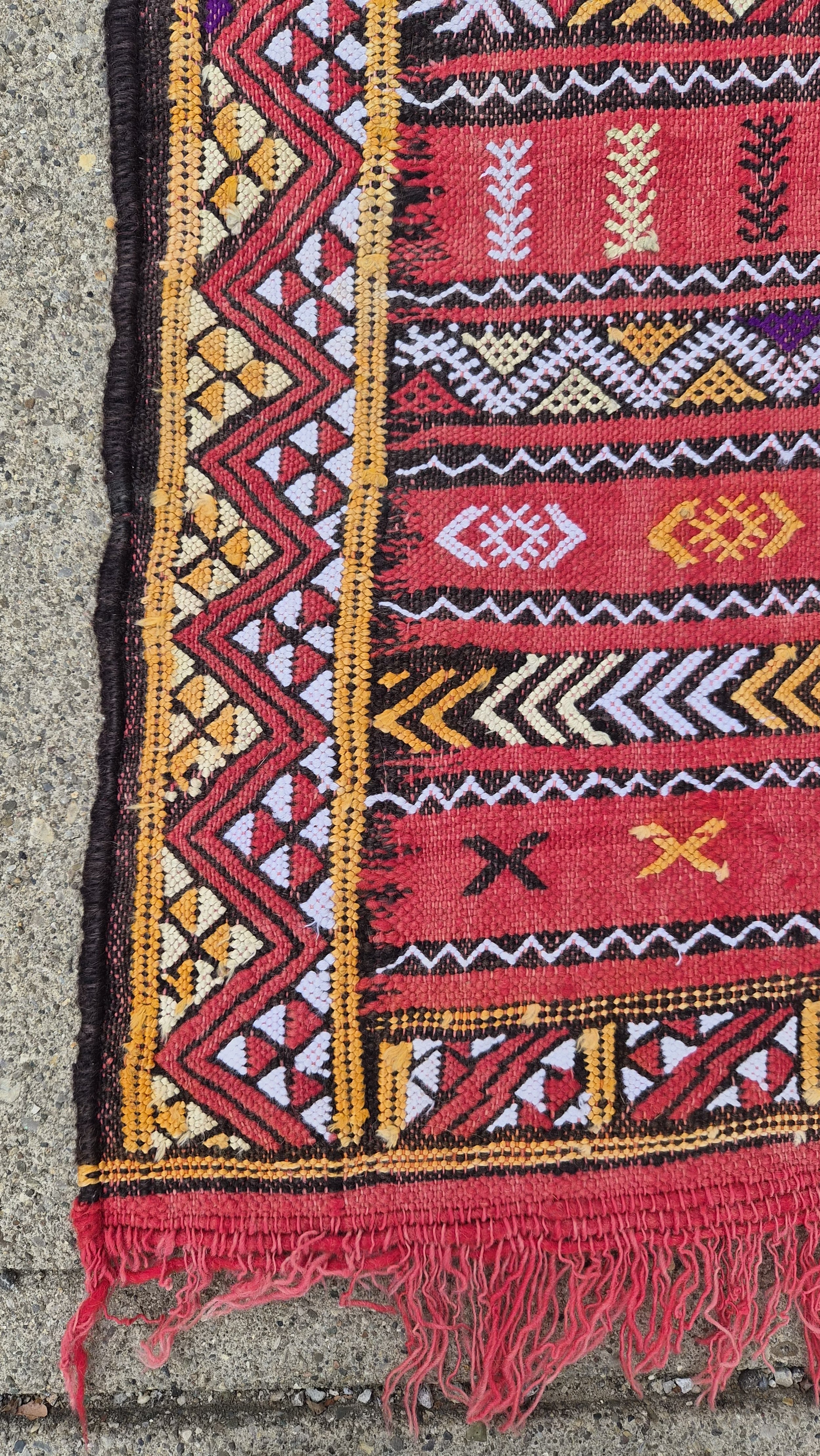 Moroccan Kilim rug flatweave in shades of red, ivory, and orange.